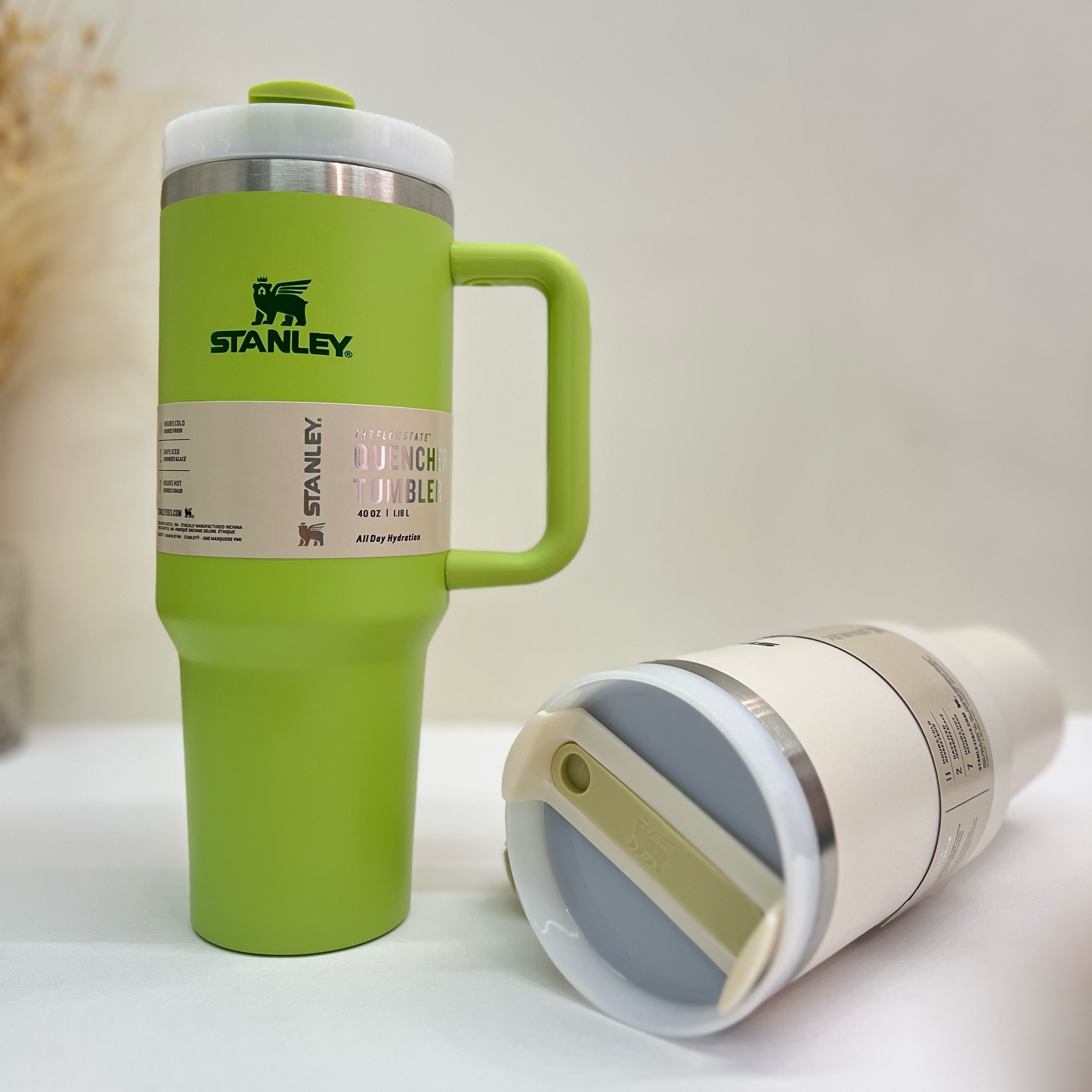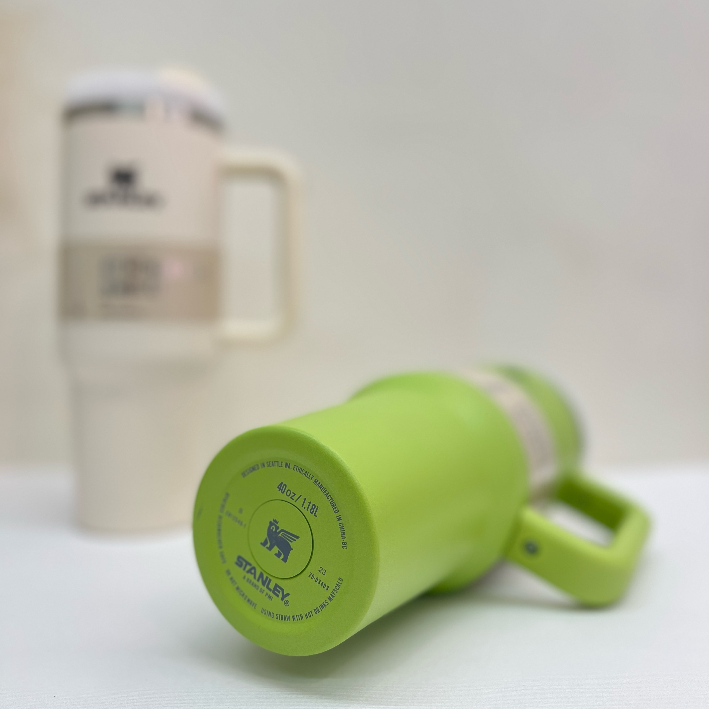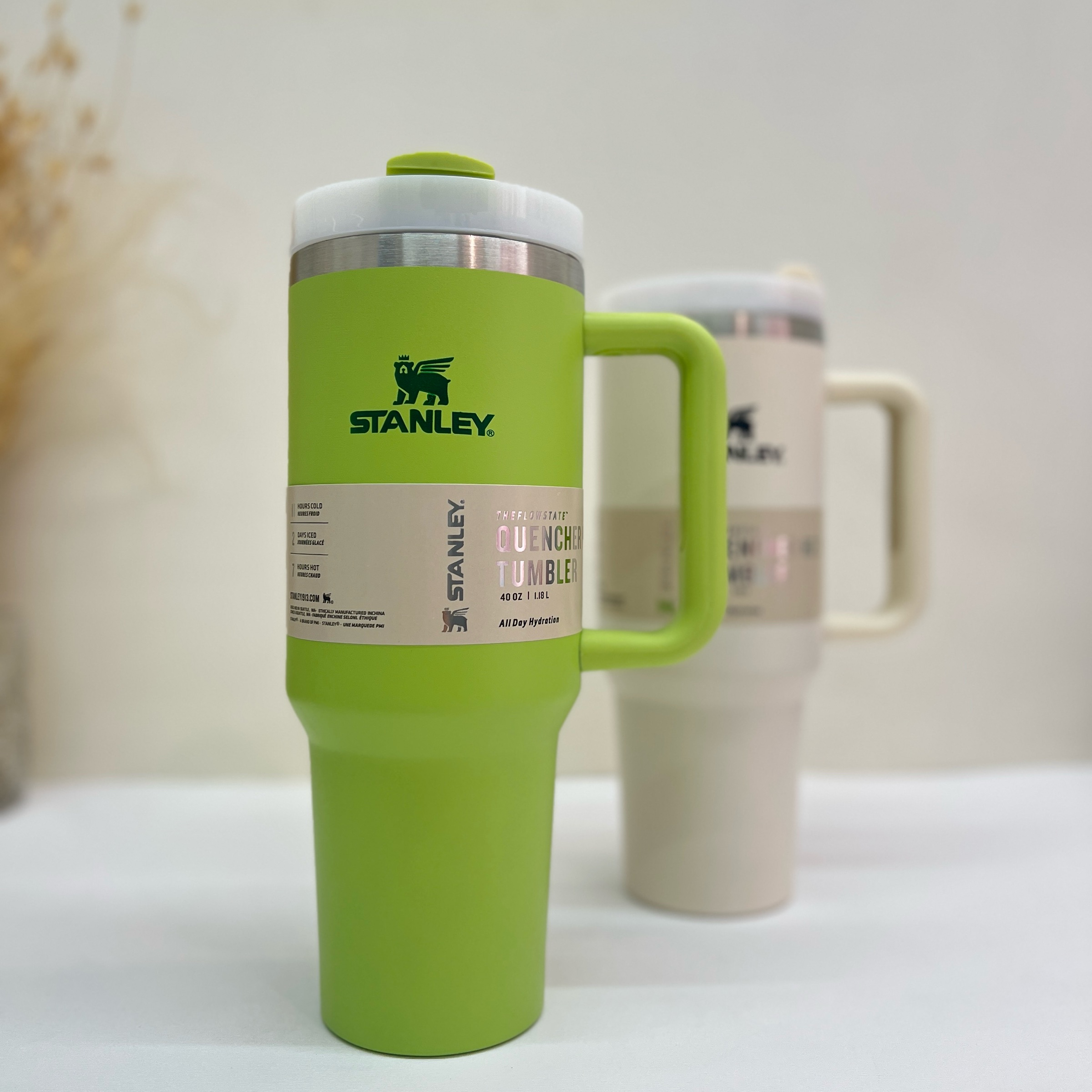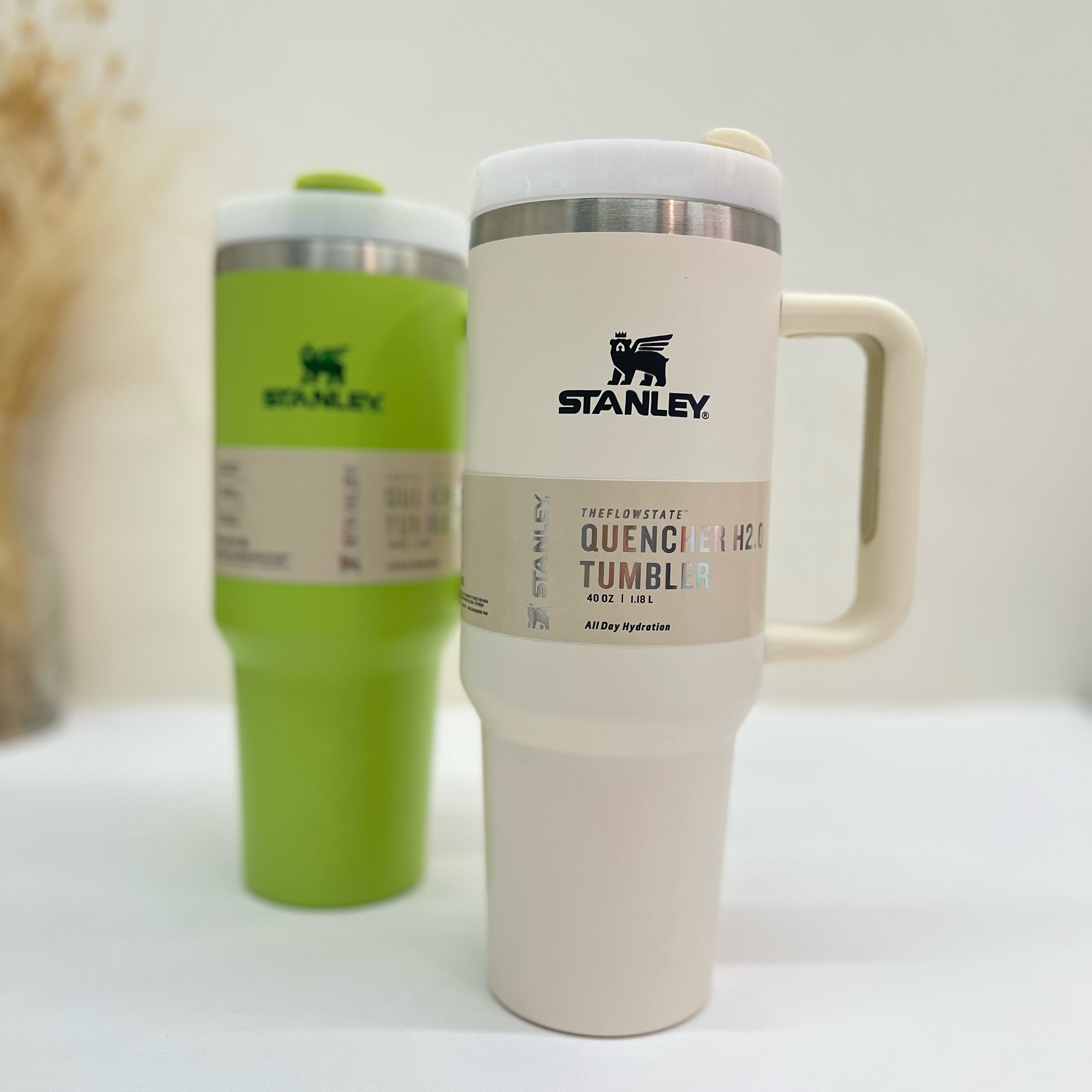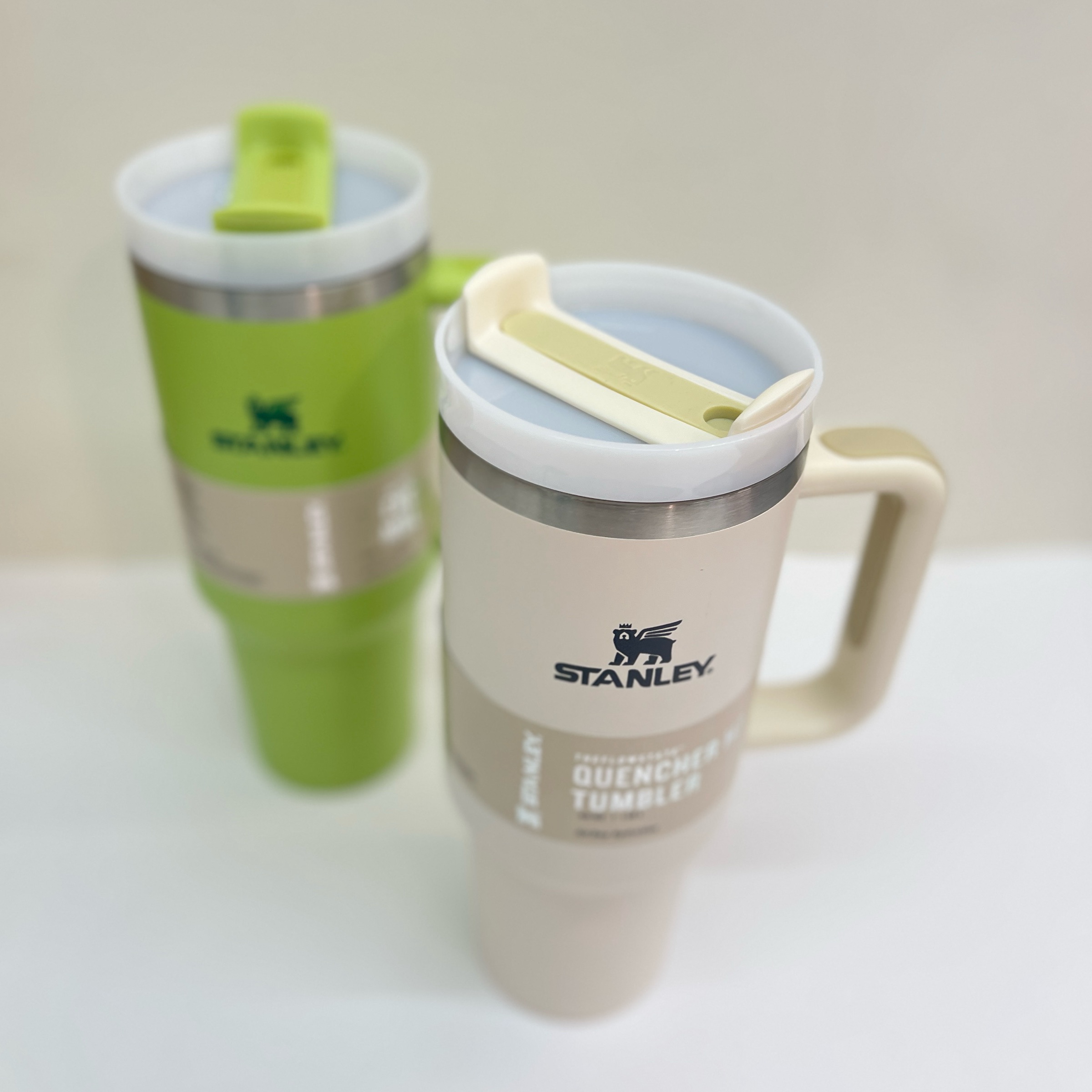 تامبلر دسته دار استنلی گنجایش ۱۱۰۰ دارای نی دارای جعبه استیل دوجداره نگهداری دمای گرم و سرد رنگ کرم سفید تخفیف دارد ب علت خط خیلی محو و جزیی در بدنه
